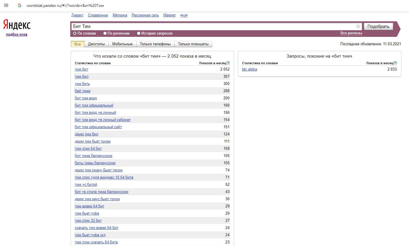 Данный интернет-лохотрон под названием "Бит Тим" скорее всего пользуется популярностью на wordstat yandex ru из-за рекламы в интернете.