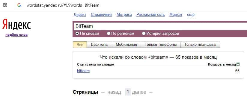 Количество запросов по бренду названия компании на английском языке "BitTeam" на Яндекс Вордстарт составляет 65 запросов за месяц.