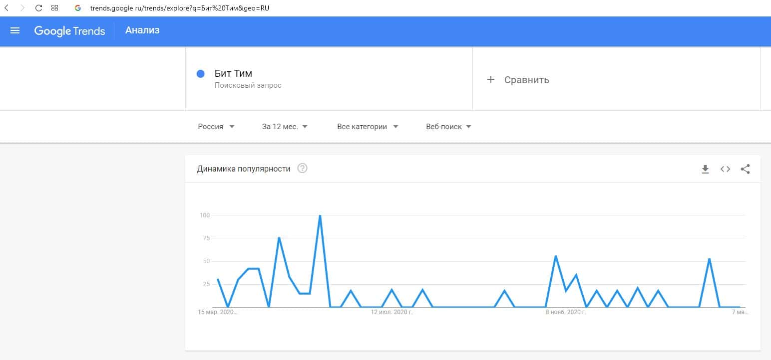 Далее предлагаем ознакомиться с динамикой популярности бренда названия компании на русском языке "Бит Тим" на trends google ru.