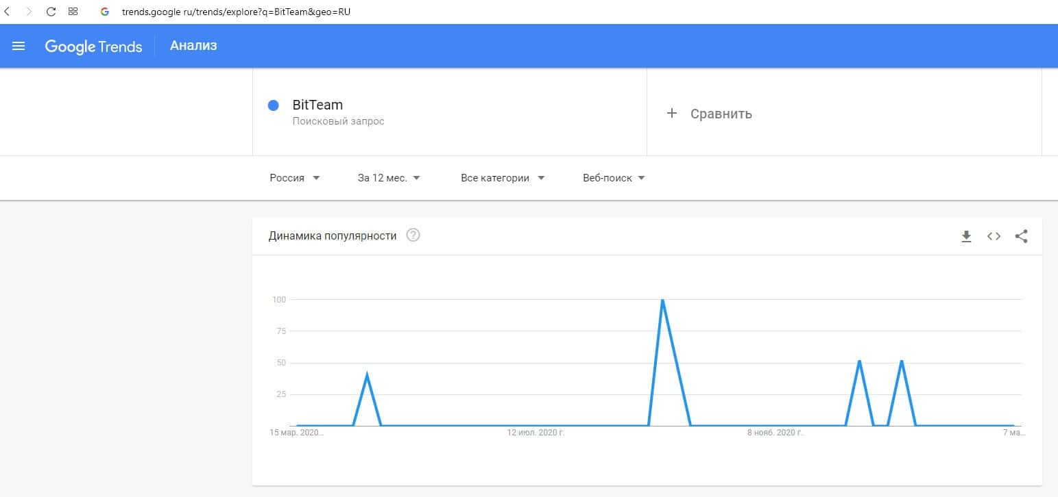 Динамика популярности запросов по бренду названия компании на английском языке "BitTeam" на Гугл Трендс предоставлена ниже.