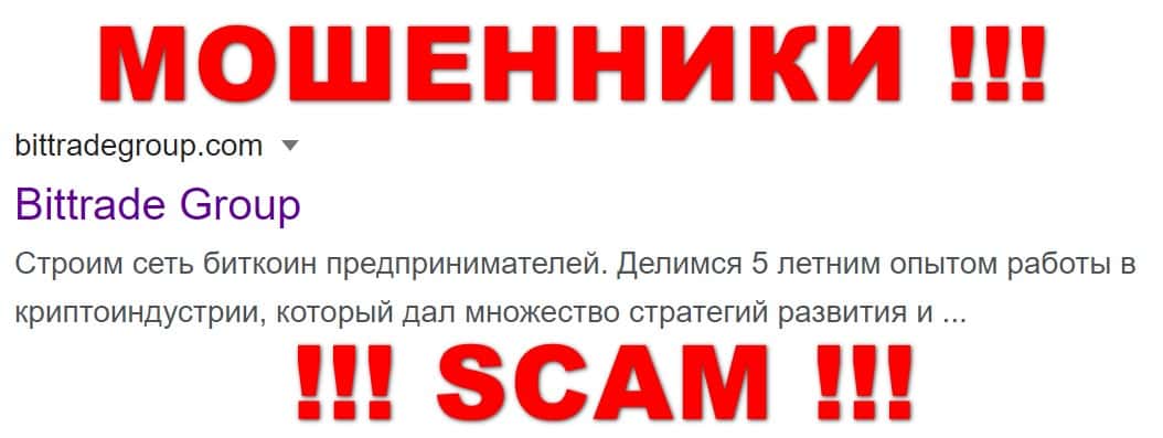 Бит Трейд Груп - мошеннический криптовалютный проект, который заманивает к себе любителей криптовалюты и торговли данным инструментом. Также у них есть много сопровождающих услуг, которые они используют, чтобы привлечь внимание потенциальных жертв. Информации по ним практически нет, поэтому мы настоятельно не рекомендуем связываться с лохотронской организацией BitTradeGroup.