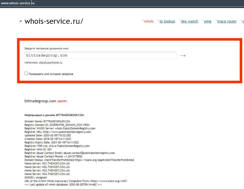 Исходя из данных интернет-ресурса whois-service ru, сайт лохотрона Бит Трейд Груп никому не принадлежит, так как они скрывают данные о себе из-за мошеннической деятельности.