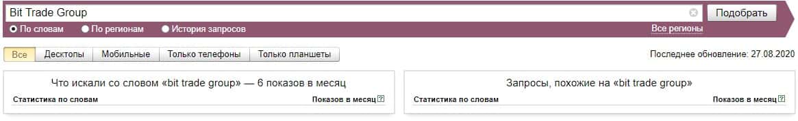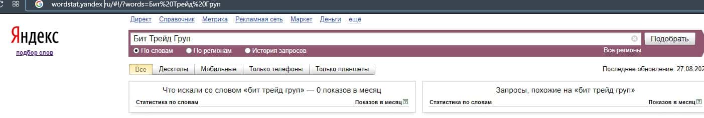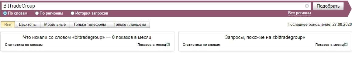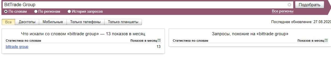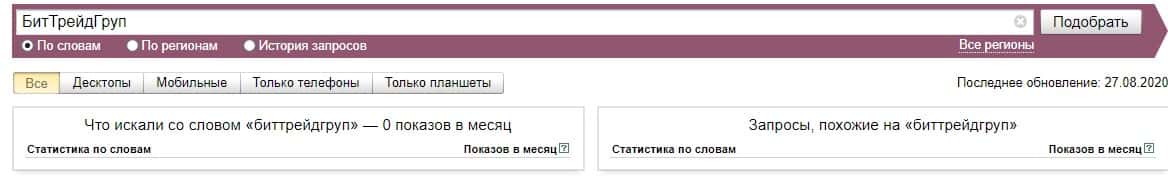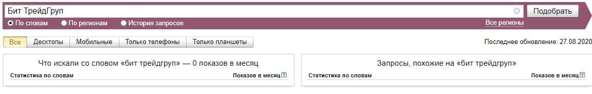 Тоже самое и по поводу запроса бренда "БитТрейд Груп", и здесь также 0 показов в месяц и сразу видно что они не популярны в Яндексе вообще.