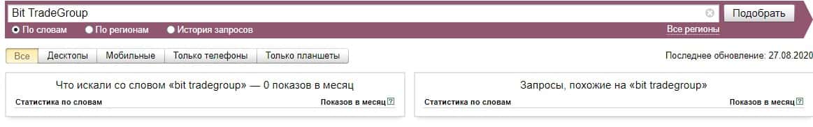 По поводу бренда "Bit TradeGroup", мошенническая контора не набрала ни одного показа в поисковых запросах Яндекс.
