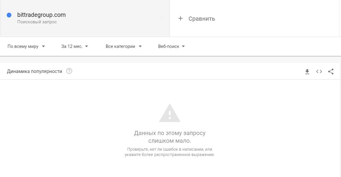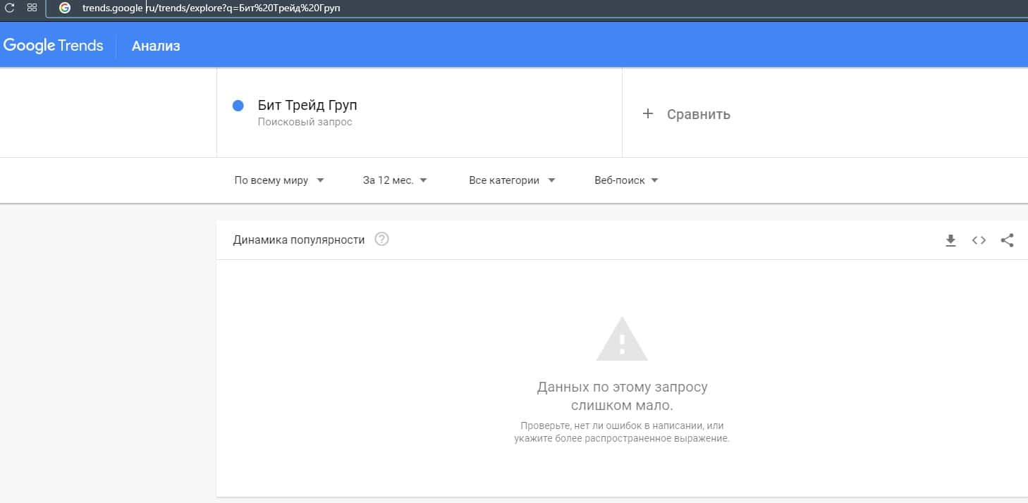 Если рассмотреть бренд "Bit Trade Group" со стороны сервиса Гугл Трендс, то здесь нам не предоставили никаких показателей и статистики.