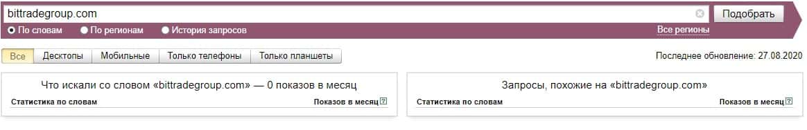 Тоже самое и касается запроса бренда "bittradegroup.com" в качестве их официального сайта - не было выявлено ни одного показа за последний месяц в Яндекс.