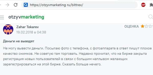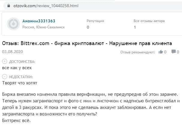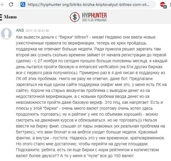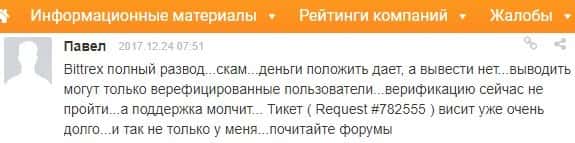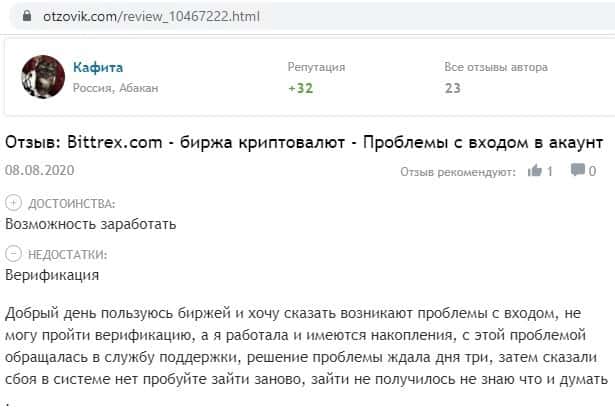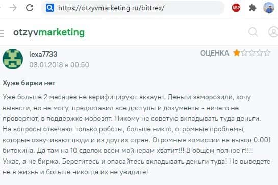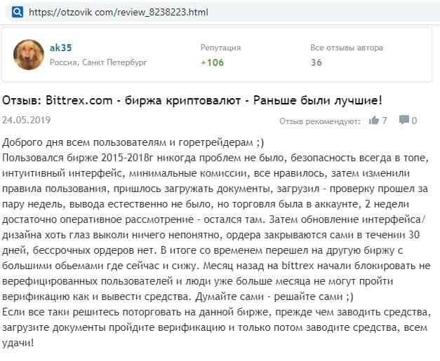 Клиент брокерской компании Bittrex жалуется на ресурсе otzovik com на то, что после введения системы верификации, на этой площадке стало сложно работать.