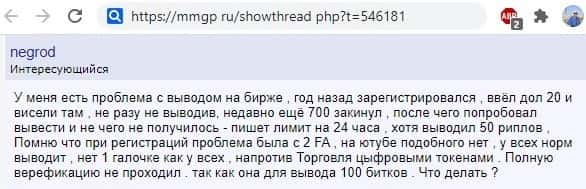 Трейдер в своем отзыве на сайте mmgp ru жалуется на проблемы с выводом денежных средств на криптовалютной бирже Бит Трекс.