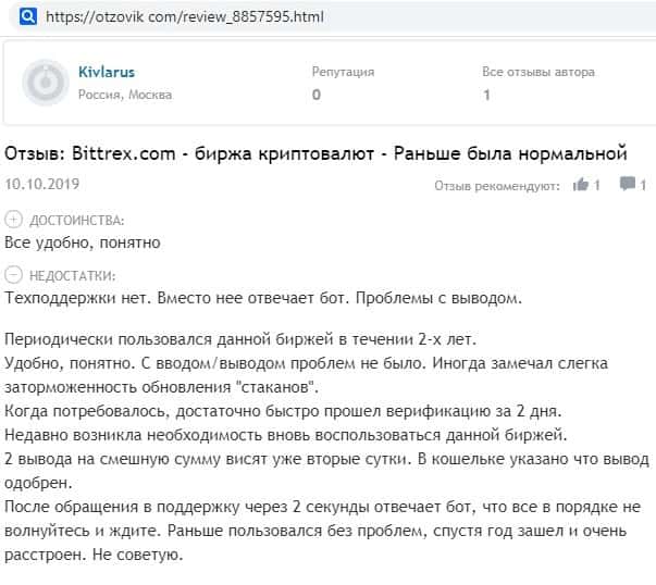 Разочарованный трейдер сообщает в своем отзыве на сайте otzovik com, что не может вывести средства из компании Bittrex, а вместо службы поддержки отвечает робот.
