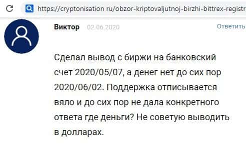 Трейдер в своем отзыве на сайте cryptonisation ru сообщает, что сделал вывод с криптовалютной биржи Бит Трекс, а денег на банковский счет так и не получил.