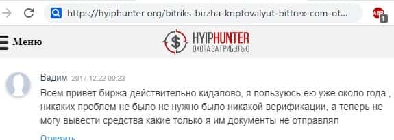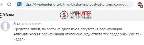 Трейдер жалуется в отзыве на сайте eto-razvod ru, что верификацию в Бит Трекс в настоящее время пройти невозможно, а без нее нельзя вывести деньги.