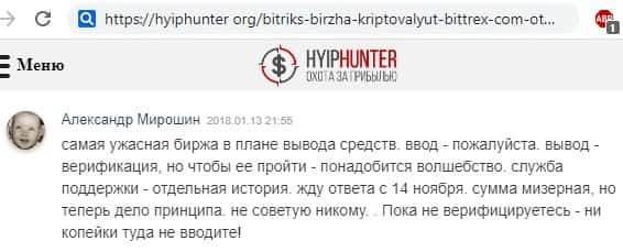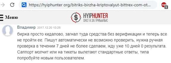 Трейдер неудовлетворен тем, что для вывода денежных средств из компании Бит Трекс требуется верификация, осуществить которую довольно проблематично.