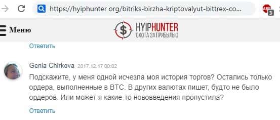 Трейдер в своем отзыве на сайте hyiphunter org недоумевает по поводу того, что у него исчезла история торгов на криптовалютной бирже Бит Трекс.