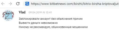 Клиент компании Бит Трекс в своем отзыве на ресурсе eto-razvod ru сообщает, что эти мошенники заблокировали его аккаунт и лишили возможности вывести деньги.