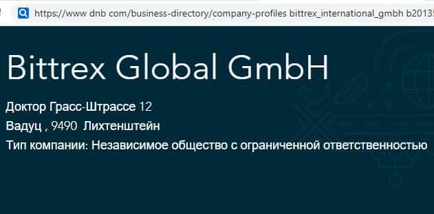 Компания Bittrex Global GMBH располагается в Лихтенштейне и является по своему статусу независимым обществом с ограниченной ответственностью, по адресу: