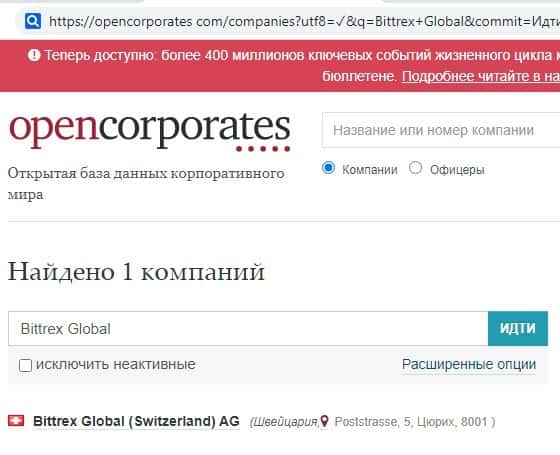 По другому запросу в базе данных корпоративного мира opencorporates com найдена компания Bittrex Global, но зарегистрирована она почему-то в Швейцарии.
