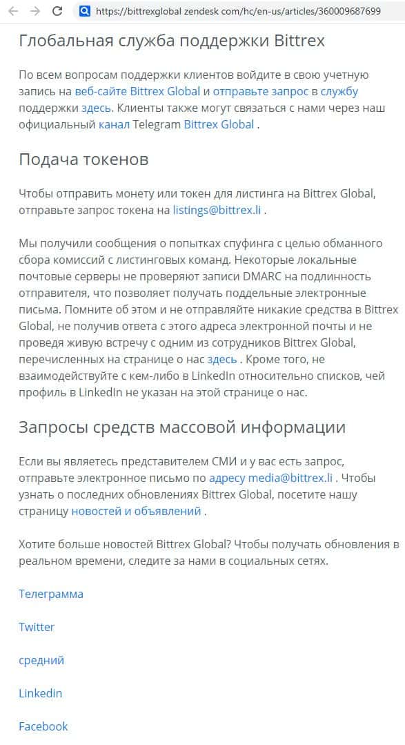 Для связи с группой поддержки мошенники из компании Bittrex предлагают на своем сайте воспользоваться социальными сетями Linkedin, Телеграмм, Twitter и Facebook, а также публикуют два адреса электронной почты: