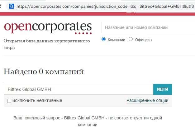 В открытой базе данных корпоративного мира opencorporates com компания Bittrex Global GMBH почему-то не найдена, что вызывает сомнения в ее легальности.