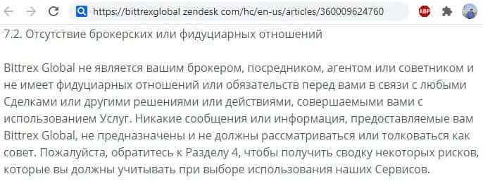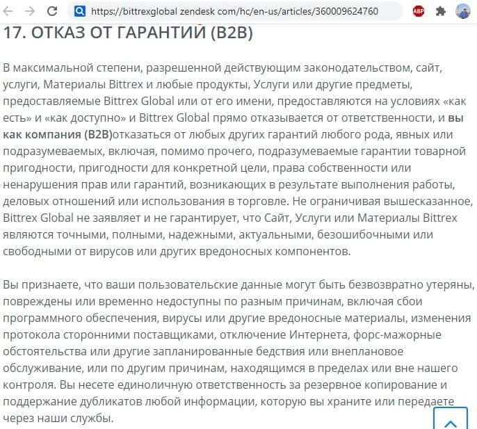 Компания Bittrex отказывается от любой ответственности перед клиентами и гарантий надежности своей торговой платформы.
