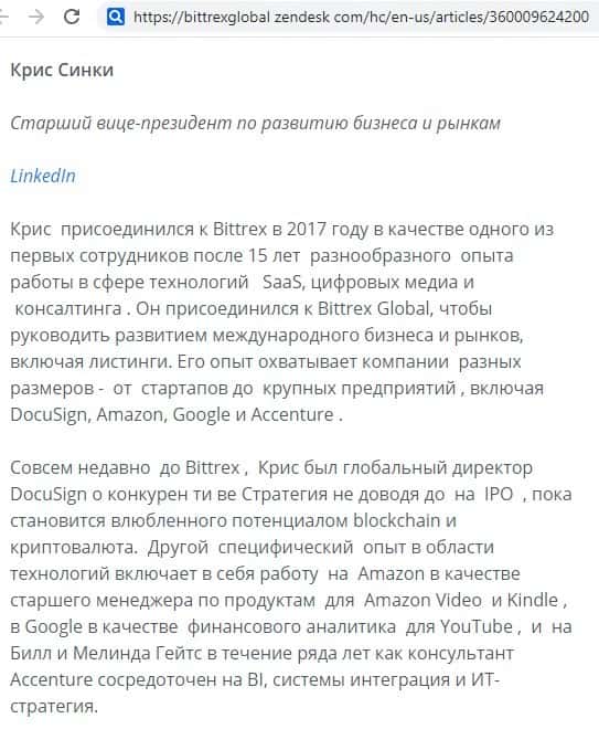 Сведения о старшем вице-президенте криптовалютной брокерской компании Бит Трекс по развитию бизнеса и рынкам Крисе Синки;