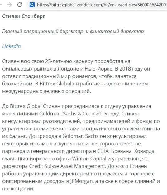 Сведения о главном операционном директоре и финансовом директоре криптовалютной брокерской компании Bittrex Стивене Стонберге;