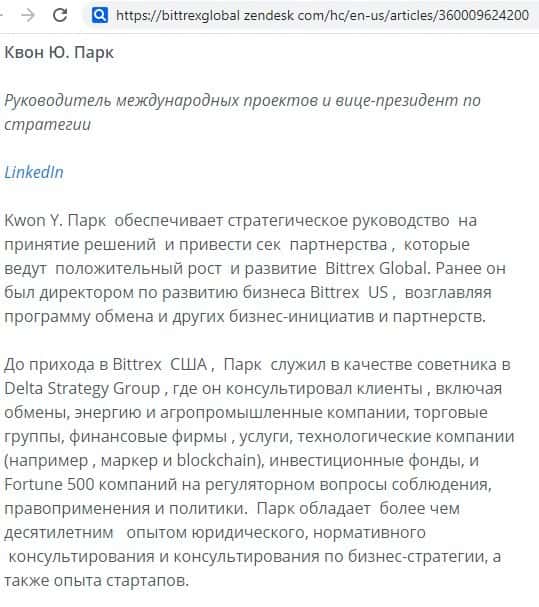 Сведения о руководителе международных проектов и вице-президенте по стратегии криптовалютной брокерской компании Бит Трекс Квоне Ю. Парке;