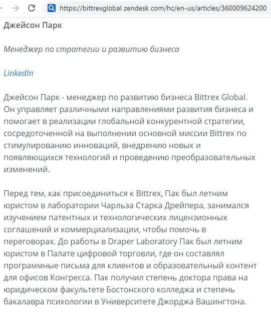 Сведения о менеджере по стратегии и развитию бизнеса криптовалютной брокерской компании Bittrex Джейсоне Парке.