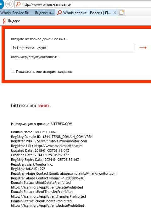 Сведения о владельце доменного имени официального сайта криптовалютной компании Bittrex Com на аналитическом ресурсе whois-service ru не найдены.