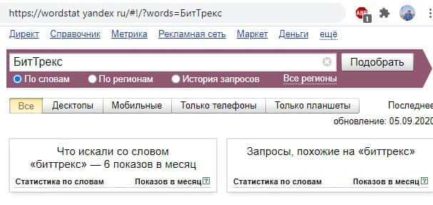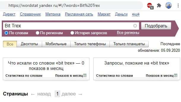 По русскоязычному бренду "Бит Трекс" на сайте Яндекс Вордстат выявлен всего один запрос, не густо.