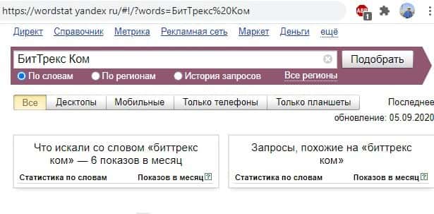 По русскоязычному бренду "БитТрекс" без пробела на Яндекс Вордстат выявлено 6 запросов в месяц.