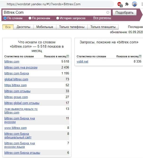 По англоязычному бренду "Bittrex Com" без точки на Яндекс Вордстат выявлено также 5518 запросов в месяц, очень неплохие показатели.