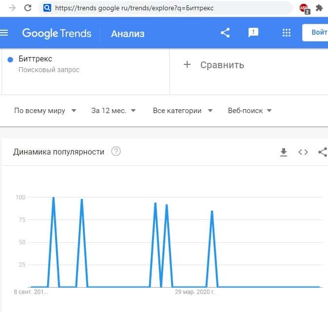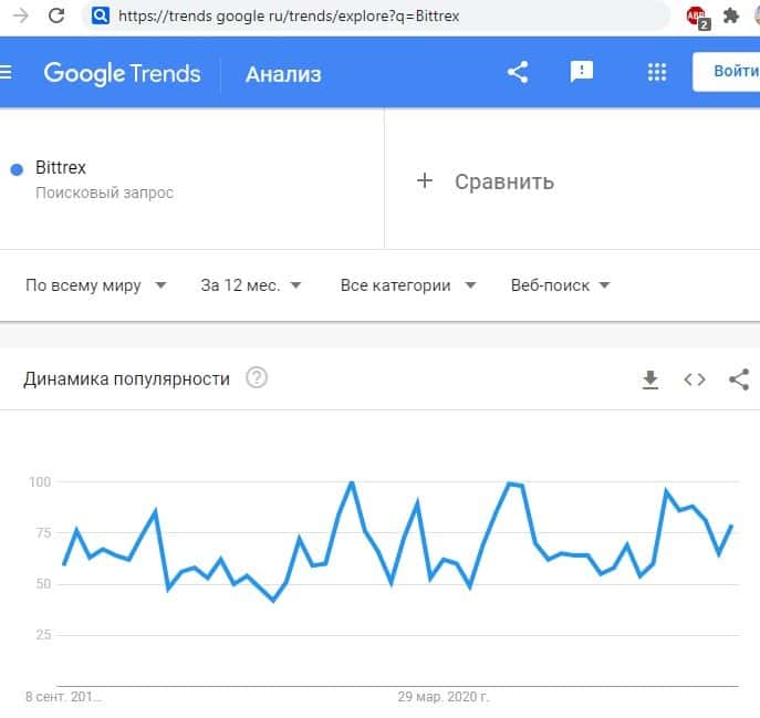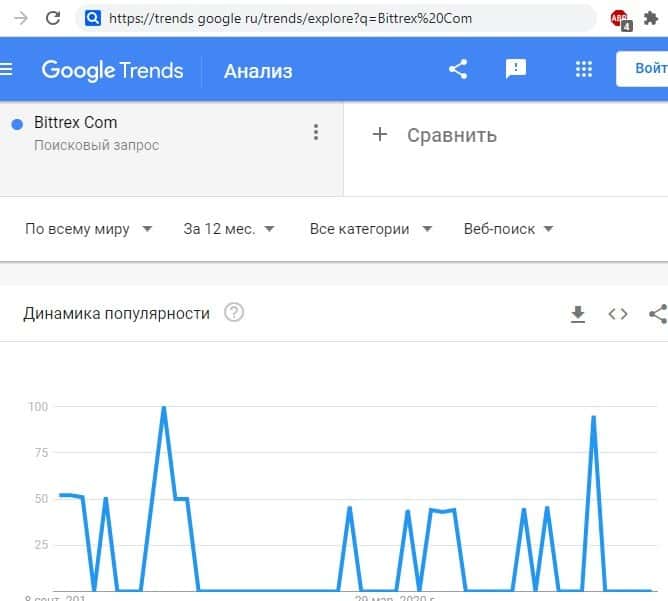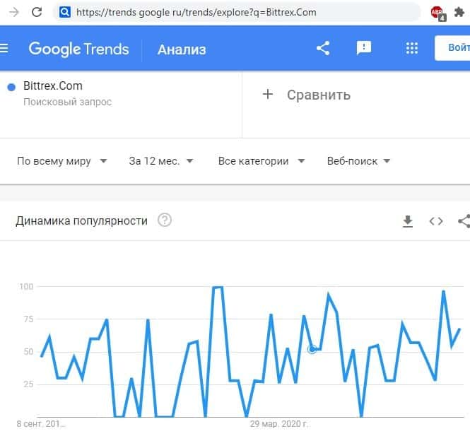 - Сведения о брендовых запросах о компании Bittrex на сайте trends google ru
