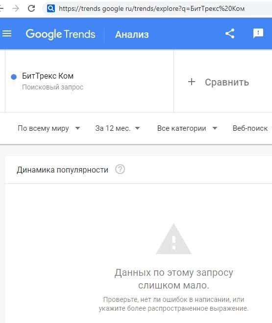 Активность поисковых запросов на сайте trends google ru по бренду "БитТрекс" без пробела в прошлом году достигала 100, а в последнее время снизилась до нуля.
