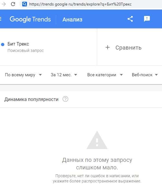 Поисковых запросов по русскоязычному бренду "Бит Трекс" на интернет-сервисе trends google ru не выявлено, или слишком мало данных.
