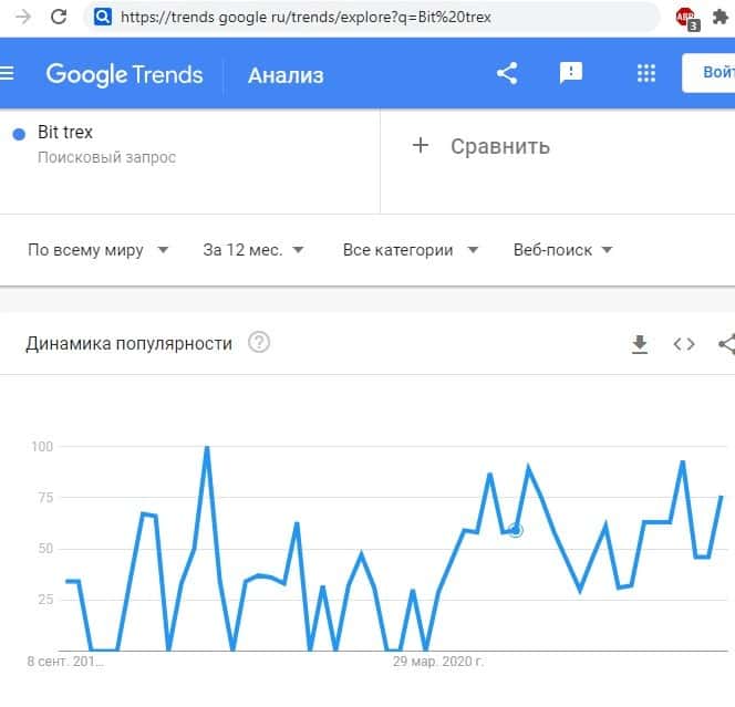 Активность поисковых запросов на сайте trends google ru по бренду "Bit Trex" с пробелом в прошлом году достигала 100, а в последнее время составляла от 20 до 80.