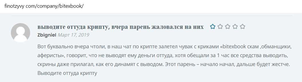 Мужчина пишет в своем отзыве, что он видел комментарий, где люди жаловались на то, что мошенники BitexBook не выводят деньги. Так что надо бежать с этой площадки побыстрее.