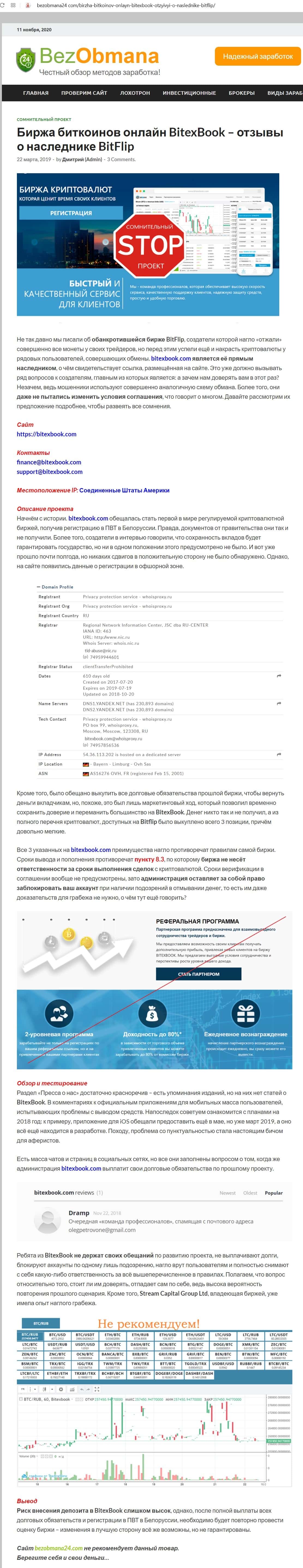 Человек написал отзыв, что владельцы биржи BitexBook являются создателями другого лохотрона, который кинул много людей на деньги, вносить средства сюда нельзя.
