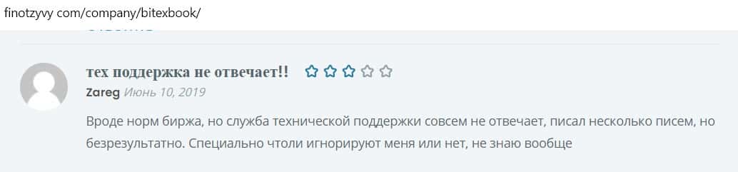 Мужчина оставил отзыв о криптобирже Битекс Бук, что их техподдержка вообще не работает. Это подозрительный момент, так как работа саппорта важна для клиентов.