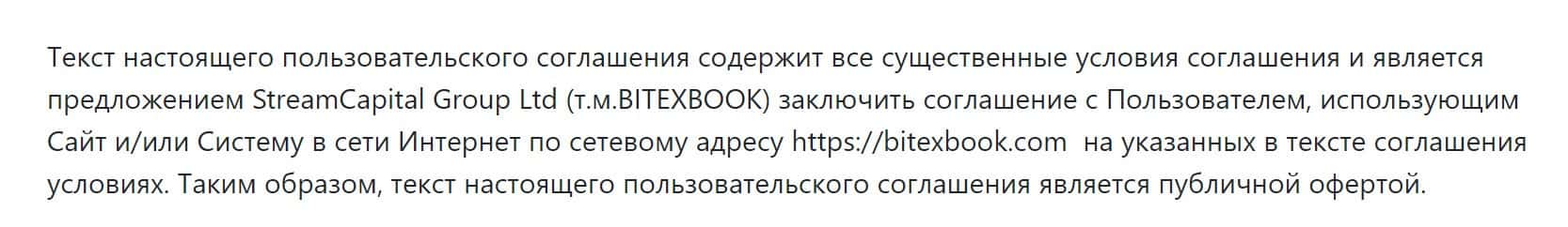 Юридическим лицом брокерской конторы Битекс Бук является организация StreamCapital Group Ltd, о чем написано в их клиентском соглашении.