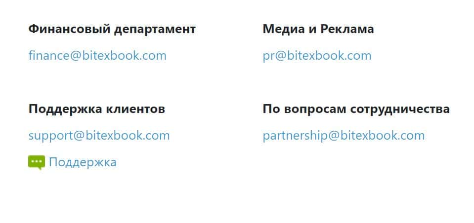На сайте криптовалютной биржи Битекс Бук нет номеров телефонов. Имеются адреса электронной почты, куда можно написать свои вопросы организаторам.