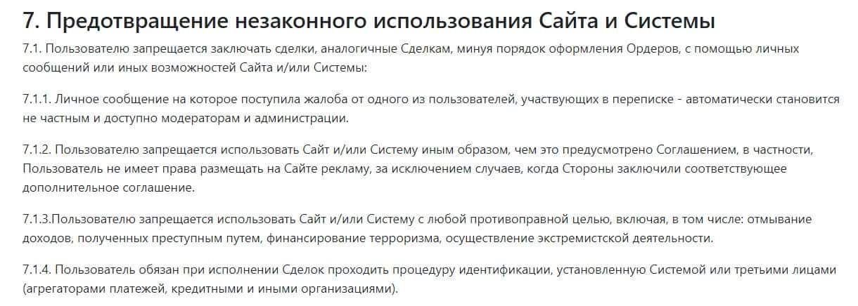 В разделе 7 пользователь может прочитать о том, какие сделки ему запрешщено проводить на платформе BitexBook.