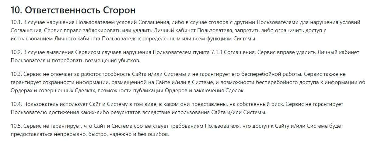 Десятый раздел договора BitexBook говорит, что, если компания уличит клиента в нарушении соглашения, то она заблокирует его учетную запись.