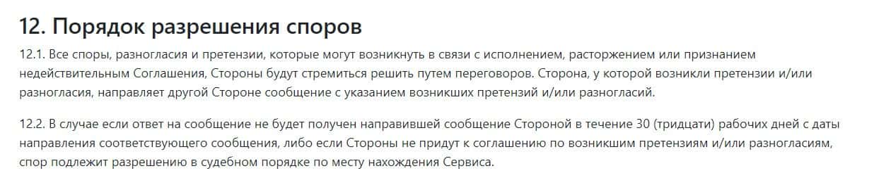 В разделе 12 соглашения компании BitexBook говорится о том, как и где будут решаться спорные вопросы, возникшие между клиентом и компанией.