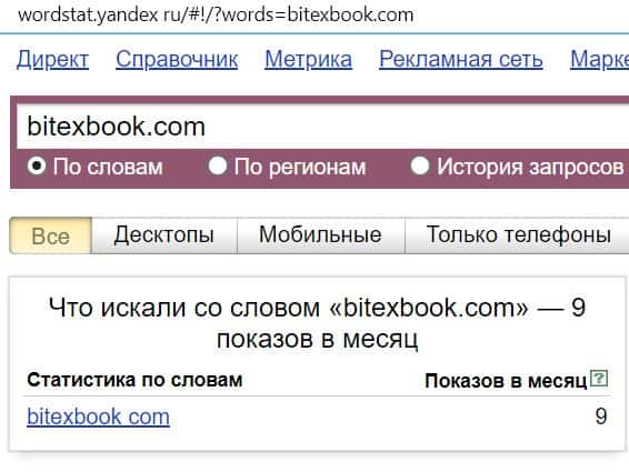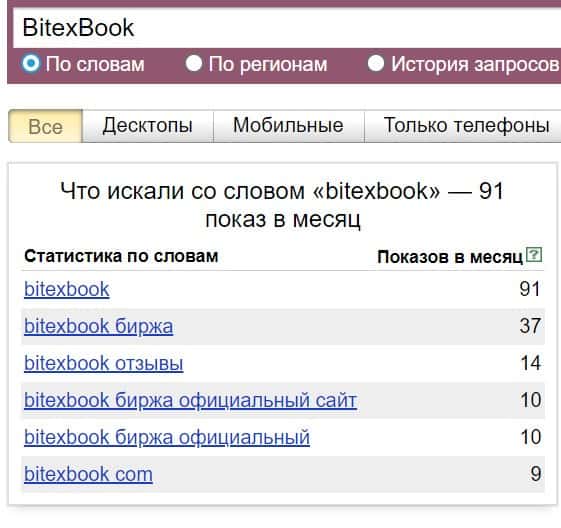 Название мошеннической конторы "BitexBook", написанное на английском языке, пользователи искали в системе Яндекс нечасто, программа выдает 91 показ.