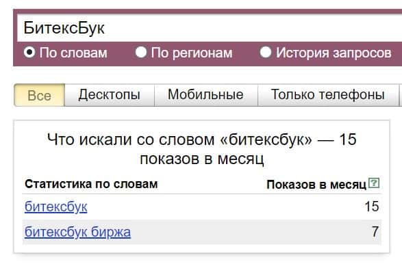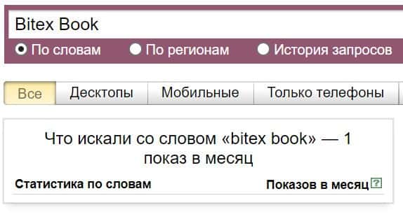 Название бренда на русском языке без пробела "БитексБук", пользователи пытались найти в системе Яндекс 15 раз за месяц.
