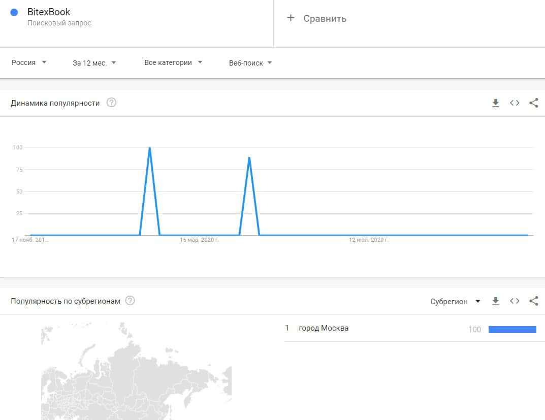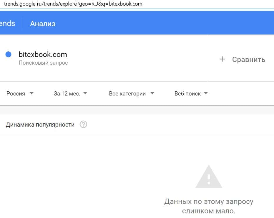 Доменное имя мошеннического сайта "bitexbook.com" вбивали в поисковую систему Гугл слишком редко, поэтому данных по этому запросу практически нет.