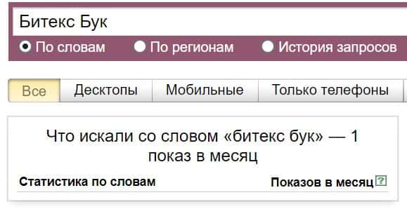 Посмотрим, сколько раз люди искали название бренда "Битекс Бук" на русском языке с пробелами: результат 1 показ.