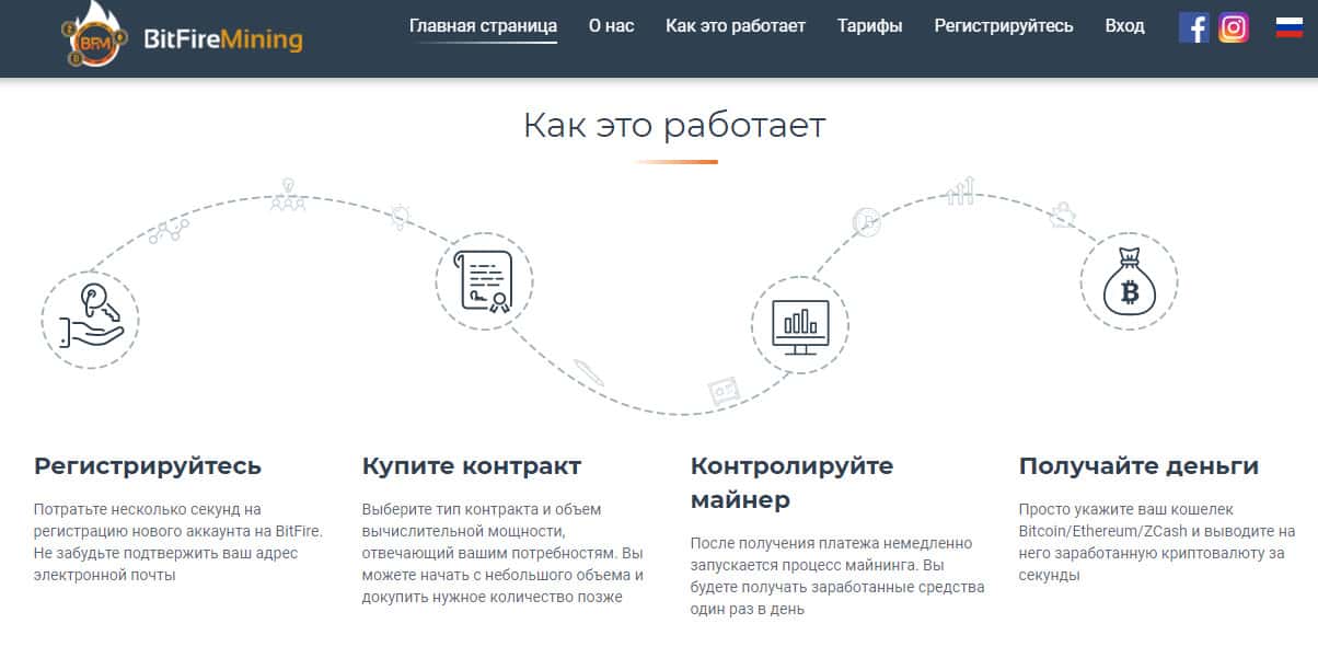 После на подвальном сайте аферистов Bitfire-Mining следует довольно типичный и банальный раздел с довольно сомнительной платформой проходимцев Битфаир Майнинг, под предлогом которой они пытаются навязать свою мошенническую шаражку. На изображении, расположенном ниже, вы можете наглядно увидеть данный раздел подвального сайта жуликов.