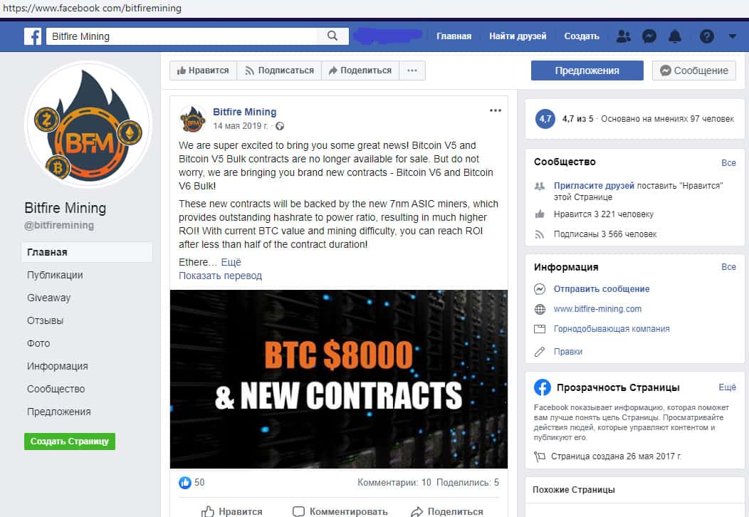 Дабы соответствовать современным трендам шулера Битфаир Майнинг обзавелись страницами в социальных сетях одной из которых является Facebook, где у мошенников Bitfire-Mining имеется подписчиков. На изображении, расположенном ниже, вы можете увидеть непосредственно внешний вид страницы проходимцев Битфаир Майнинг в социальной сети Фейсбук.