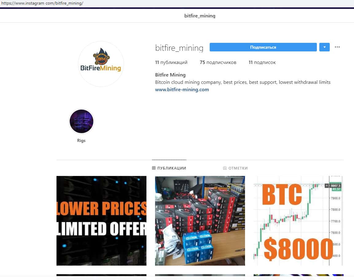 Имеется у мошенников Битфаир Майнинг и страница в социальной сети Instagram, где у шулеров Bitfire-Mining имеется крайне мало подписчиков, что говорит о халтуре шулеров Битфаир Майнинг, которые создали данную страницу отчасти для виду и толком не продвигают ее. На изображении, расположенном ниже, вы можете увидеть страницу жулья в социальной сети Инстаграм.